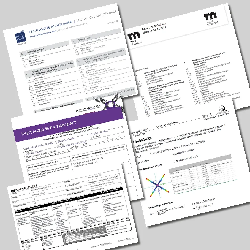 Wir kümmern uns um alle erforderlichen Statik- und Standsicherheitsnachweise sowie um technische Freigaben. Damit Ihr Stand nicht nur beeindruckt, sondern auch alle Vorschriften erfüllt.